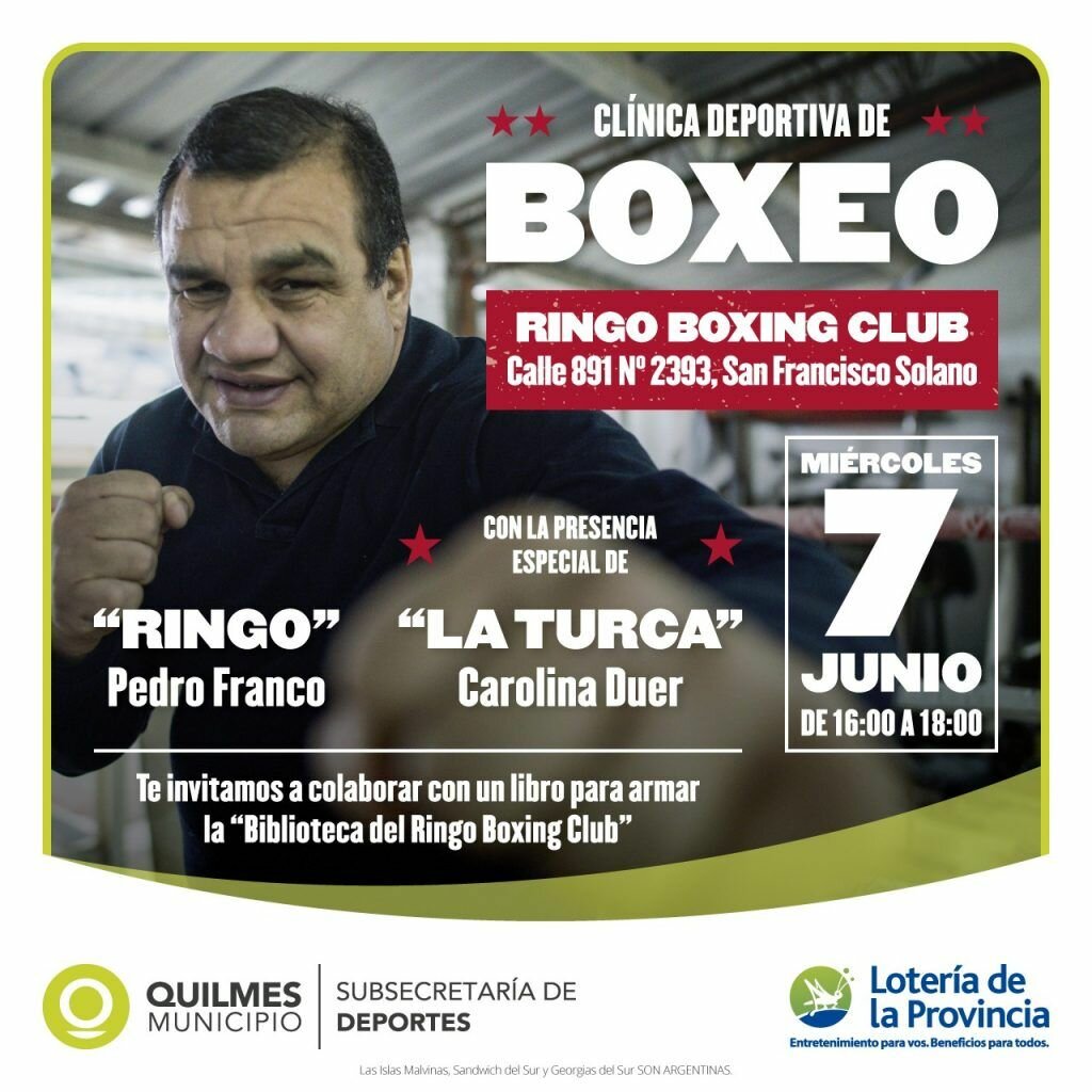 El Municipio de Quilmes, a través de la Secretaría de Gobierno y Derechos Humanos, invita a la comunidad a participar de la clínica deportiva de boxeo, que se llevará a cabo el próximo 7 de junio, de 16:00 a 18:00, en el “Ringo Boxing Club” – calle 891 nº 2393, entre 823 y 824, San Francisco Solano -.