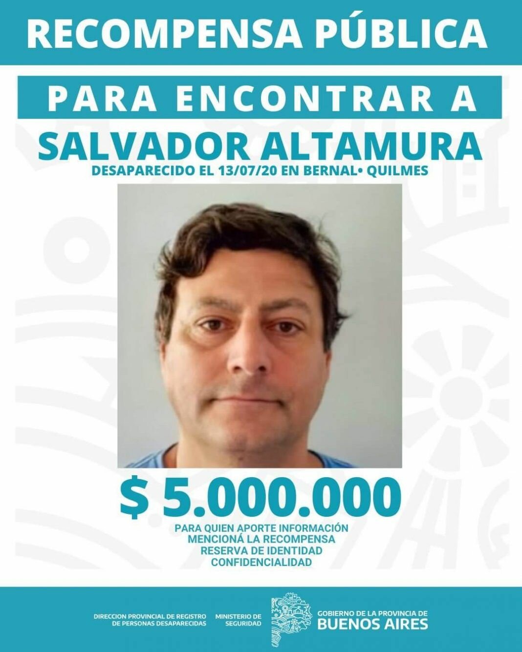 El Ministerio de Seguridad a través de la Dirección Provincial de Registro de Personas Desaparecidas ofrece pública recompensa de entre $2.500.000 y $ 5.000.000 a quien aporte datos que permitan dar con el paradero de Salvador Altamura de 48 años.
