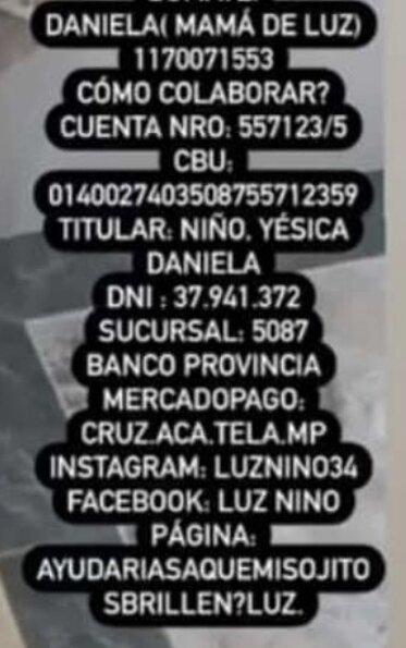 Luz tiene 11 años, vive en San Francisco Solano y es no vidente. Su obra social le cubre todo el tratamiento en el exterior pero su familia necesita el aporte de la comunidad para llegar a cubrir el valor del viaje, que es de $700.000.